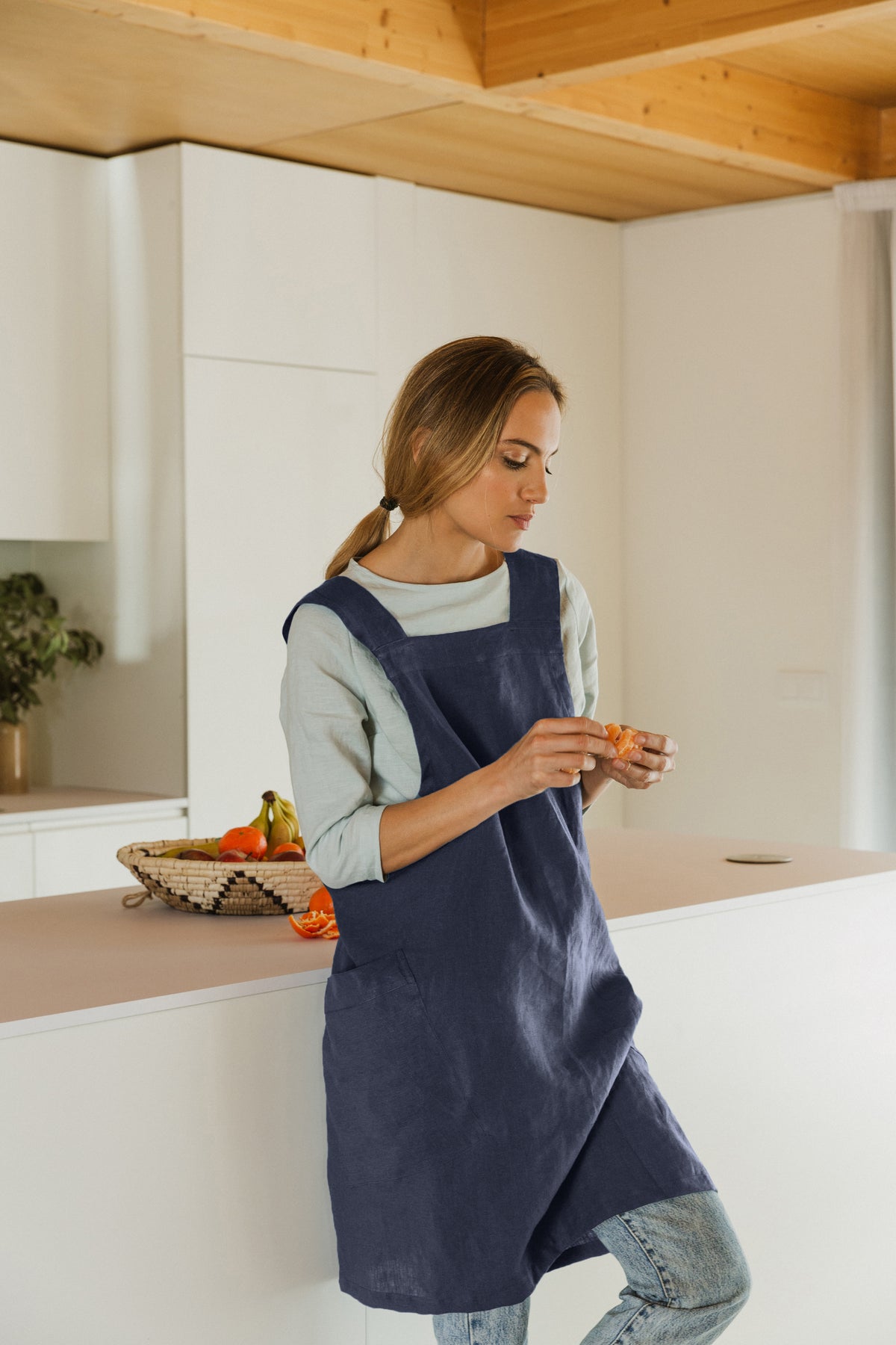 Schützen Sie Ihr T-Shirt, Ihren Rock oder Ihre Hose beim Kochen, Basteln oder Aufräumen mit unserem vielseitigen Schürzen-Möbel-Kleid. Mit seinen beiden breiten, hinten gekreuzten Trägern können Sie stilvoll arbeiten. Für die praktische Seite sorgen zwei große Taschen auf der Vorderseite. Unsere Leibchenschürze aus Leinen ist knielang und lässt Ihnen viel Bewegungsfreiheit. Das Material aus 100% Leinen sorgt für einen hohen Tragekomfort und macht Ihre kreativen Tätigkeiten noch angenehmer.
