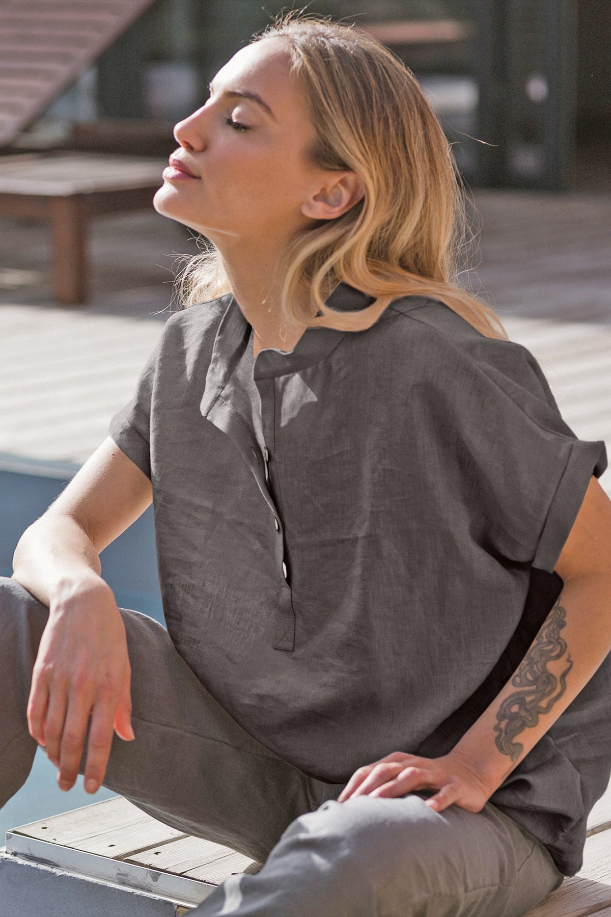 Damenbluse mit kurzen Ärmeln aus bleigrauem Leinen – Flor