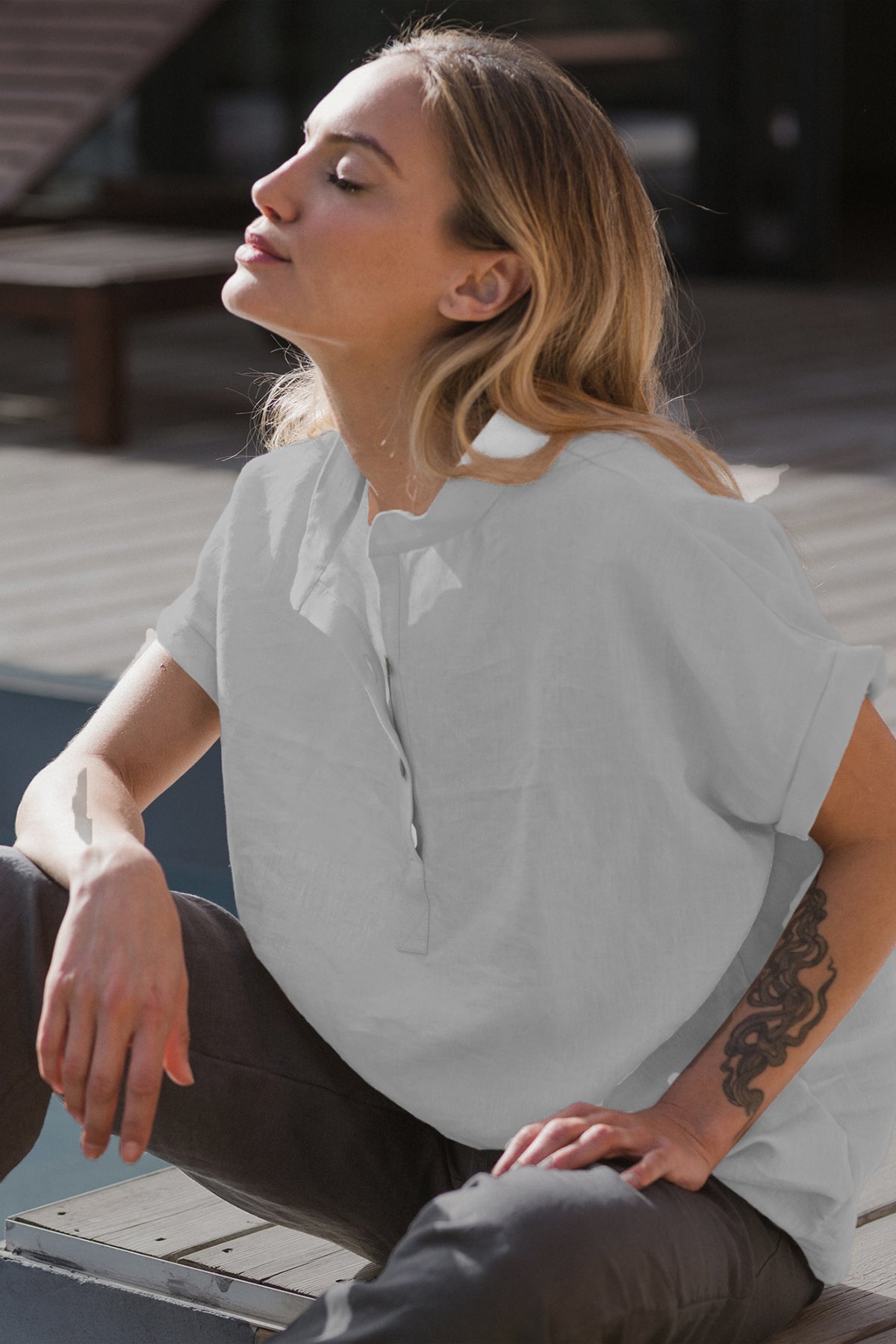 Damenbluse mit kurzen Ärmeln aus mineralgrauem Leinen – Flor