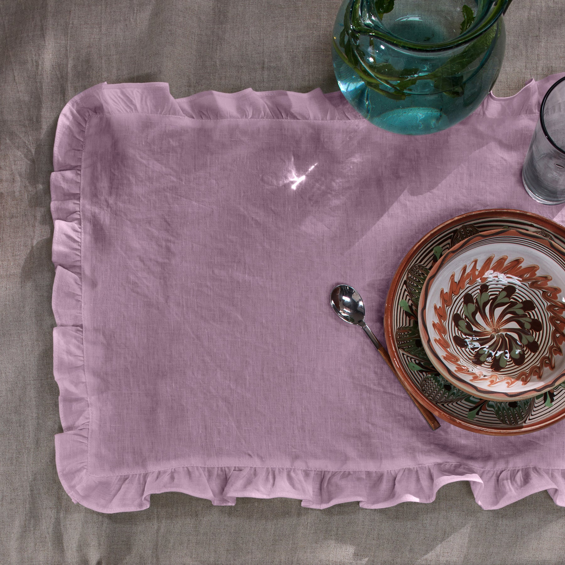 Tischsets mit Rüschen aus lilafarbenem gewaschenem Leinen